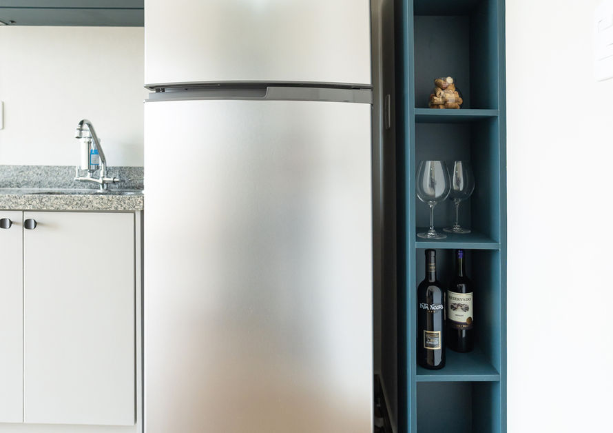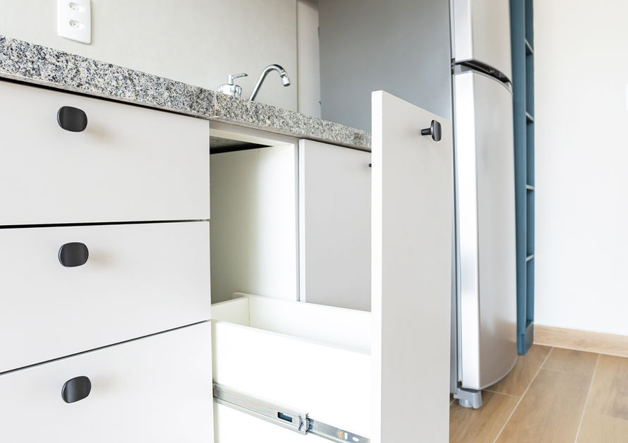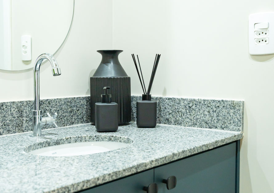 A composição partiu da bancada em cinza andorinha entregue pela construtora e foi complementada com os padrões Cinza Beton e Oceano, da Arauco, criando um ambiente contemporâneo, equilibrado e atemporal. ✨